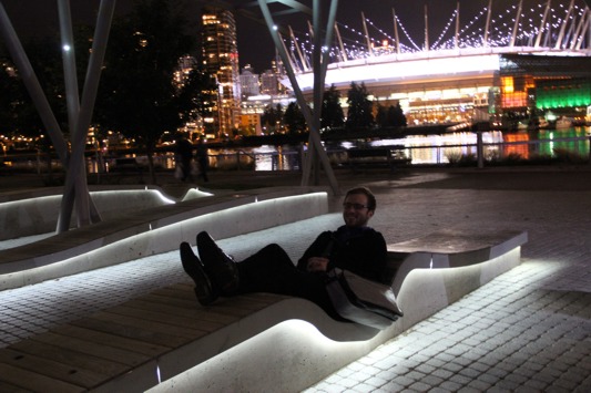 WalkMetroVan (79) November 27, 2014 533 × 355 Walk 21 Conference Adam Hyslop reclines during walkshop, Public Realm/Urban Lighting in Southeast False Creek and the Olympic Village
